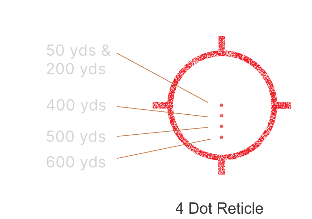 Modelul nostru de reticul cu patru puncte poate fi utilizat pentru muniție cu calibru 5,56 Nato/.223 cal., cu 62 gr M855 FMJ la aproximativ 2680 fps cu o lungime a țevii de 14,5" (36,83 cm). E posibil ca punctele de țintire din reticul să nu fie distinse fără sistemul de mărire cu magnifier.