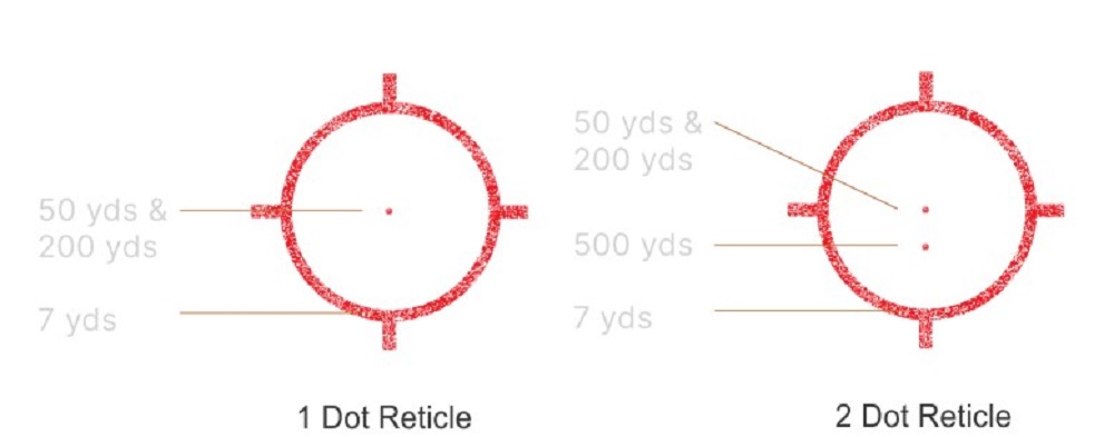 Cele două puncte din reticul pot fi distinse cu ușurință, cu sau fără mărire și oferă beneficiul celui de-al doilea punct suplimentar pentru țintire la distanță mare. Punctele de țintire din imagine se bazează pe următoarea încărcătura: .223 cal. 62 gr., 2.900 viteză