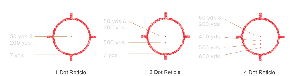 Cele două puncte din reticul pot fi distinse cu ușurință, cu sau fără mărire și oferă beneficiul celui de-al doilea punct suplimentar pentru țintire la distanță mare. Punctele de țintire din imagine se bazează pe următoarea încărcătura: .223 cal. 62 gr., 2.900 viteză
