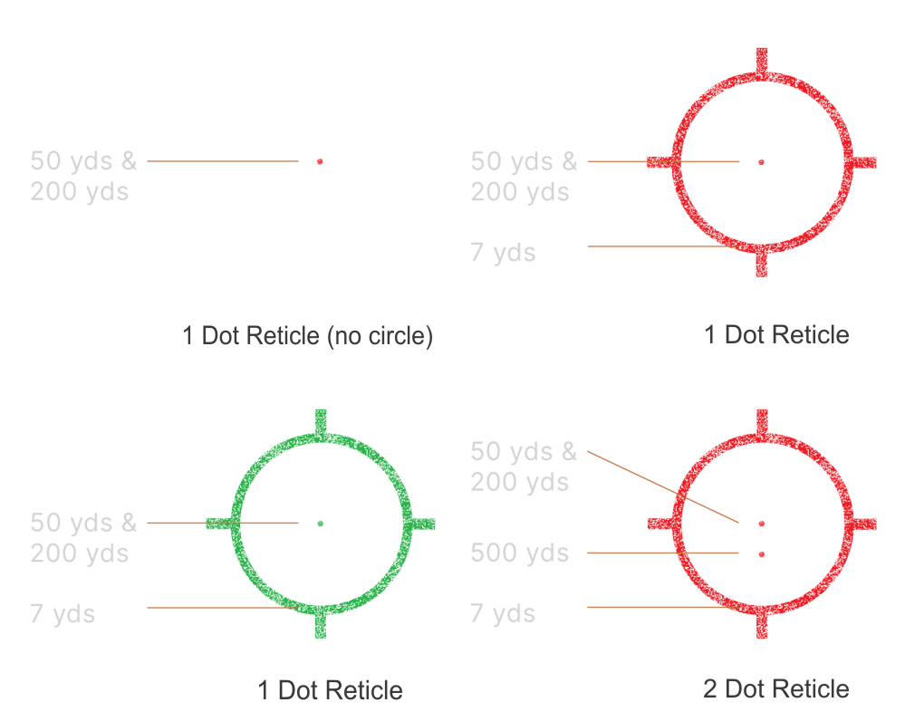 Cele două puncte din reticul pot fi distinse cu ușurință, cu sau fără mărire și oferă beneficiul celui de-al doilea punct suplimentar pentru țintire la distanță mare. Punctele de țintire din imagine se bazează pe următoarea încărcătura: .223 cal. 62 gr., 2.900 viteză
